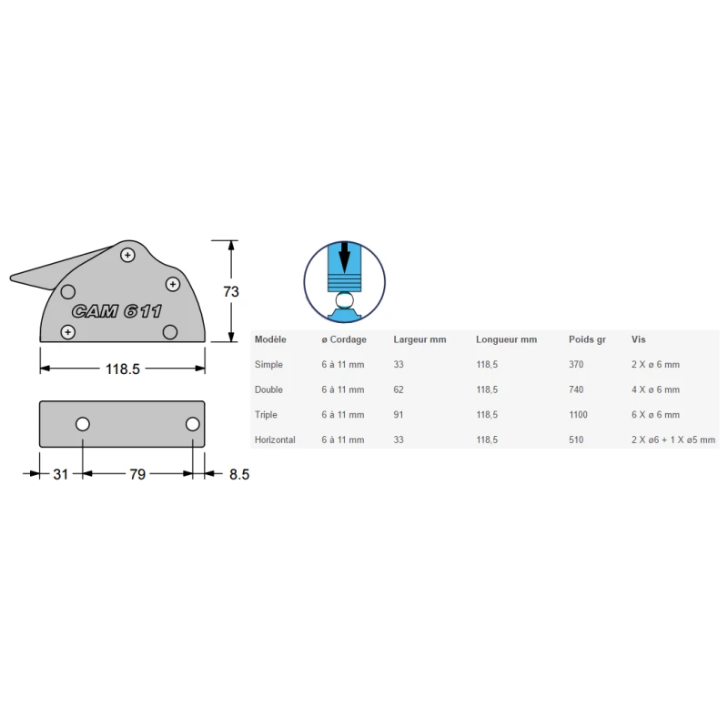 Caractéristiques techniques du ANTAL Bloqueur CAM 611 équipement et accastillage de pont pour bateau :