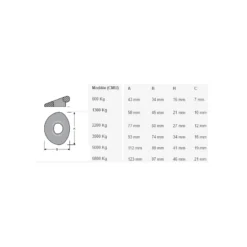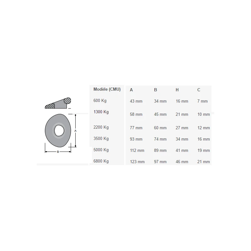 | Modèle (CMU) | ø loop idéal | Vis | Poids | A | B | H | C |