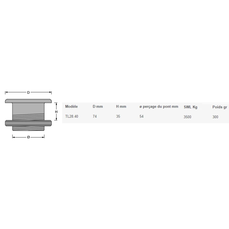 | Modèle | D mm | H mm | ø perçage du pont mm | SWL Kg | Poids gr |