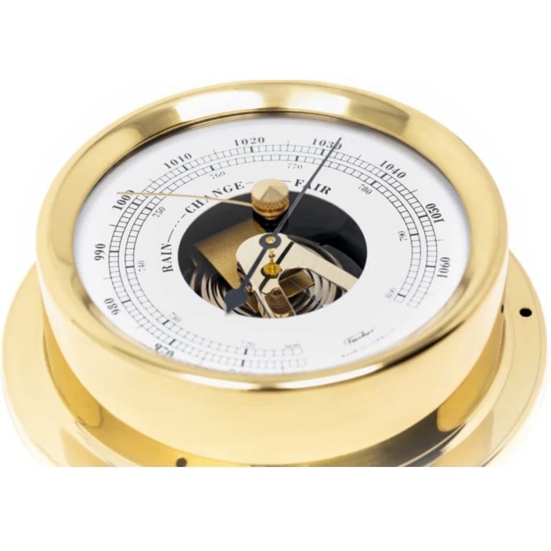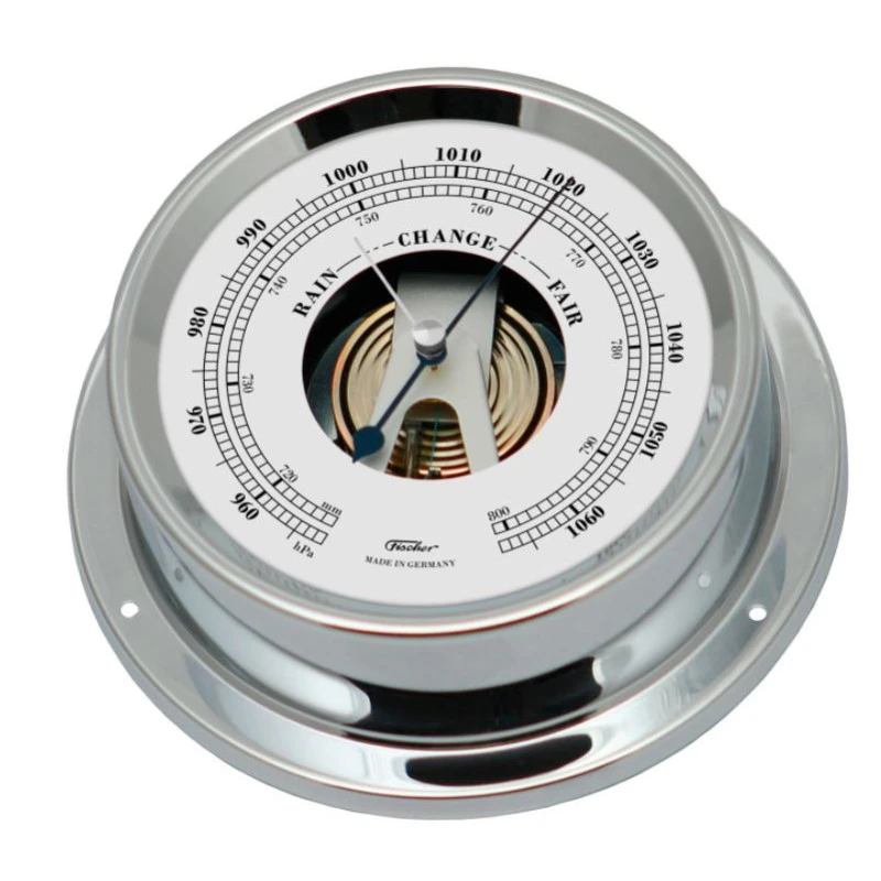 Baromètre de qualité marine cadran ø 125 mm FISCHER boîtier laiton ou laiton chromé pour l’équipement du bateau. Avec écran noir ou blanc.
