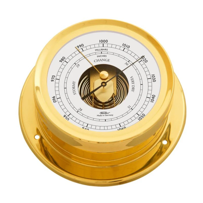 Baromètre « marin » ø 165 mm de FISCHER avec boîtier laiton pour l’équipement du bateau. Modèle à aiguille haute qualité.