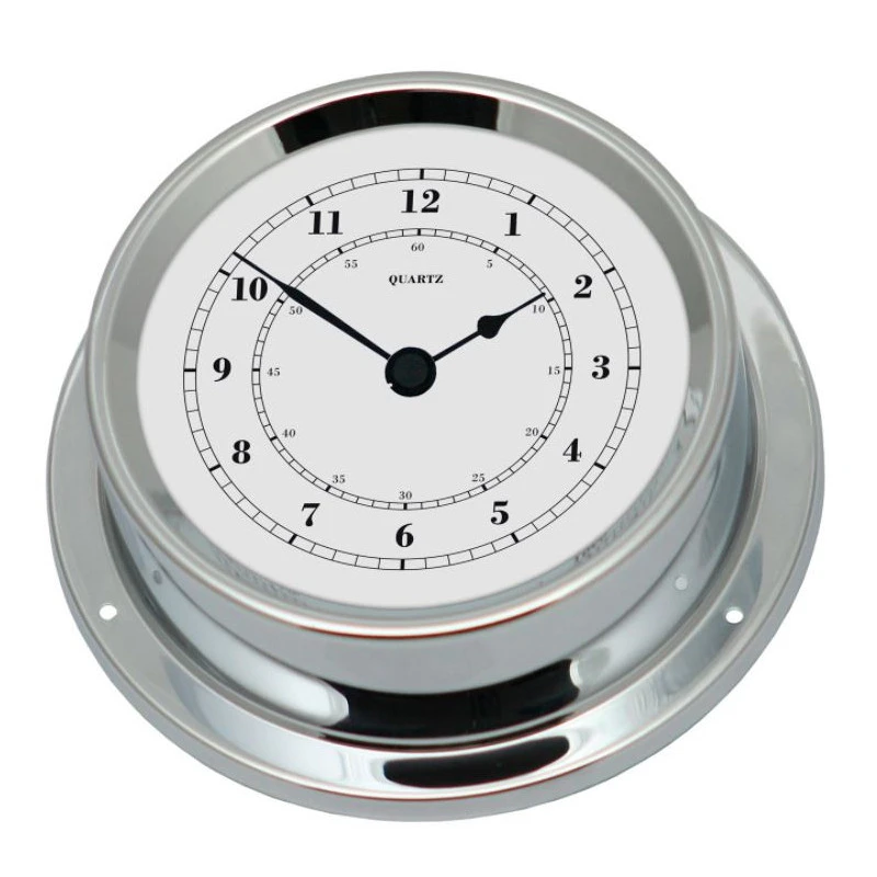 Pendule, horloge à quartz type marine en laiton ou laiton chrome ø 110 mm de fabrication FISCHER. Conçus pour l’équipement du bateau.