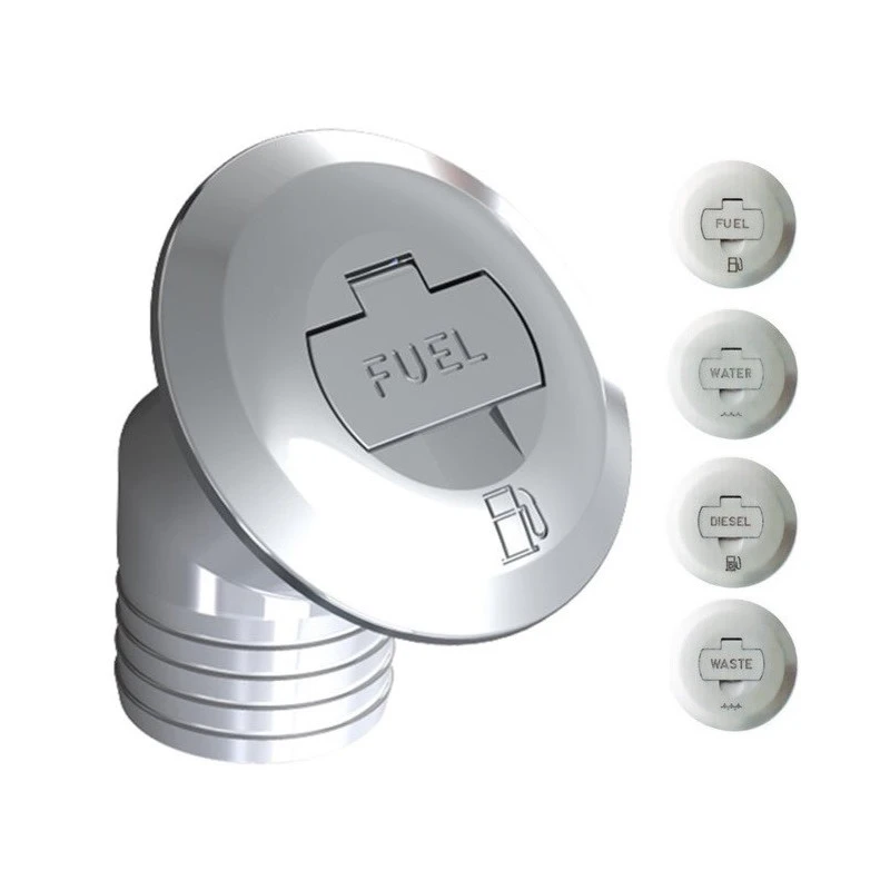 Nable en laiton avec col coudé 30° et bouchon a clé pour le remplissage de réservoir carburant, eau et eau grise sur le bateau.