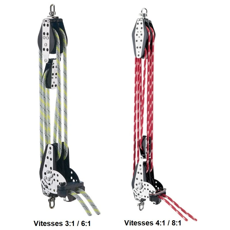 Selon la version, vitesses de 3:1/6:1 et 4:1/8:1 ce palan convient pour les voiliers de 6,5 m à 11,80 m (soit 22 à 39 pieds). Par rapport aux doubles palans classiques (palans étagés), ce modèle limite considérablement les risques que les bouts ne s’emmêlent. C’est simple : pour un réglage rapide il faut tirer sur les deux brins en même temps, pour un réglage fin ou une démultiplication plus forte, sur un seul brin !