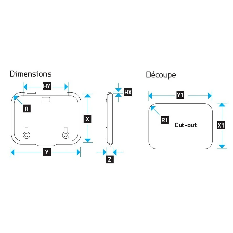 | Largeur (X) | Longueur (Y) | Epaisseur (Z) | Rayon extérieur (R) | Largeur découpe (X1) | Longueur découpe (Y1) | Rayon découpe (R1) | |||||