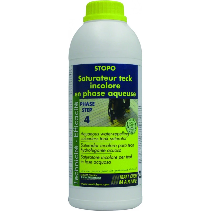Saturateur hydrofuge incolore qui permettra au teck du pont de votre bateau d’être protégé des intempéries et de ne pas gonfler, le MATT CHEM Stopo respecte l’environnement.
