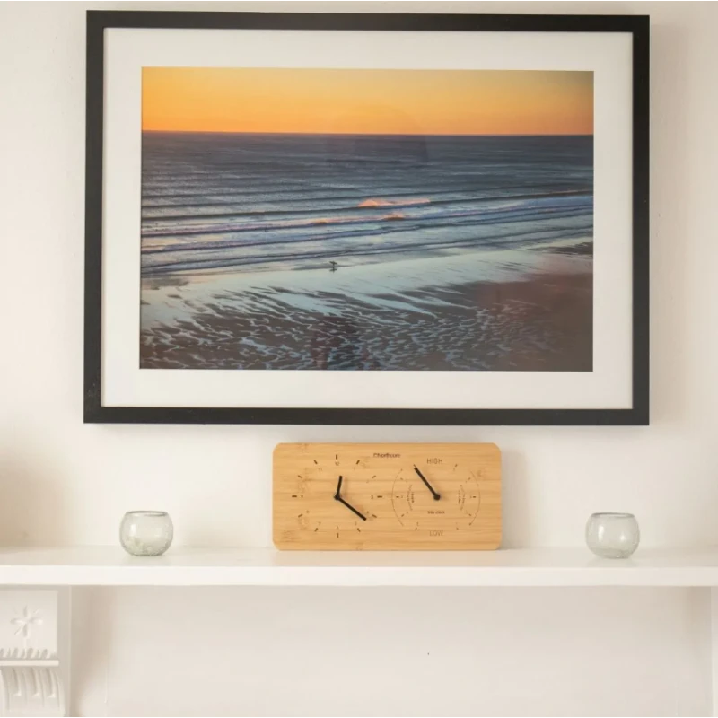 Indispensable pour les passionnés de la mer, les surfeurs, les marins comme les vanlifeurs, l’horloge en bambou naturel est conçue pour fournir un guide des heures de marée ainsi que l’heure analogique. Idéal pour visualiser d’un simple coup d’oeil l’état de la marée montante ou descendante ainsi que le temps restant jusqu’à la marée haute ou basse, l’horloge se réfère à la carte des marées locale.