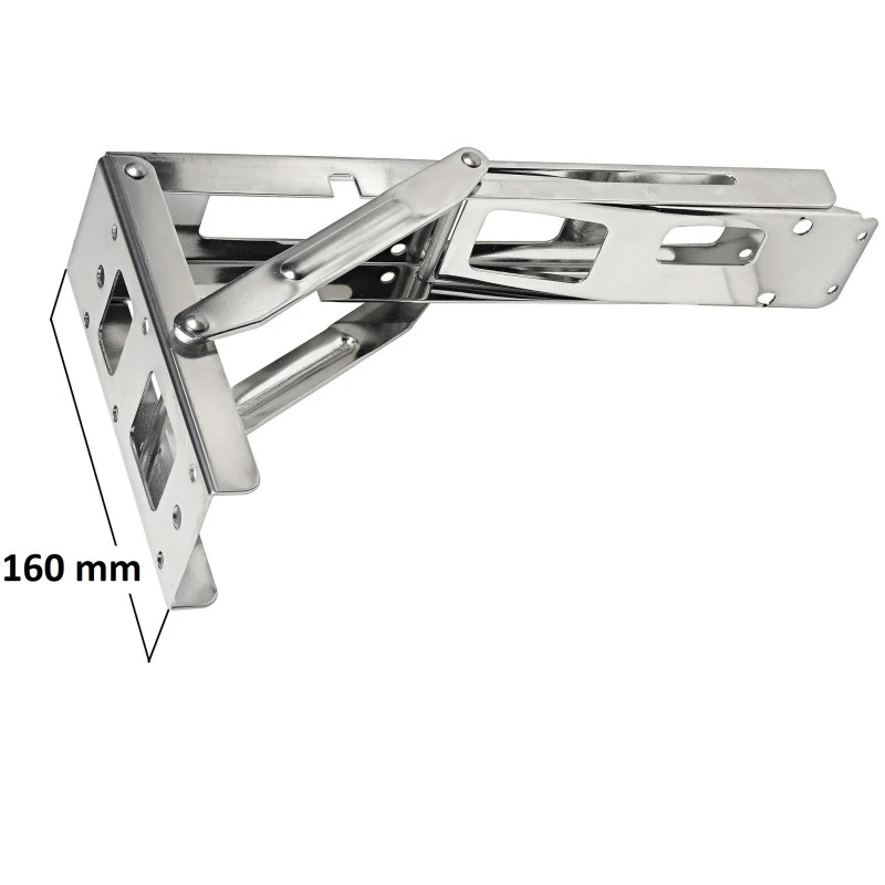 Accessoire robuste fabrication inox polie miroir pour conception de table et plan de travail repliable dans le bateau camping-car et fourgon aménagé, cette solide équerre pouvant supporter une charge de 150 Kg se replie d’une simple pression de la main, équerre très robuste idéal pour l’aménagement et conception de cuisine en intérieur et extérieur.