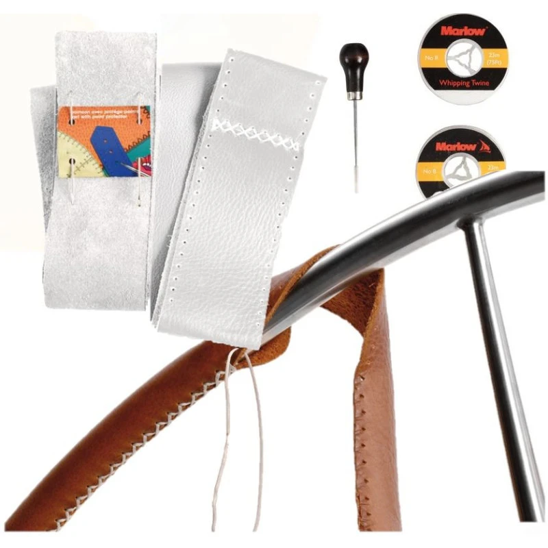 En kit complet avec cuir blanc ou gris cassé, aiguilles, poinçon et bande prédécouper pour barre diamètre max 1200 x Ø 22 mm, redonner l’aspect et le toucher cuir a votre barre à roue inox de bateau.