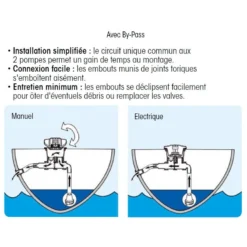 A noter, pour le modèle avec By-Pass installée sur le circuit d’une pompe électrique, la pompe de cale électrique doit être de type centrifuge ; PLASTIMO déconseille l’installation avec une pompe à membrane ou à ailettes.
