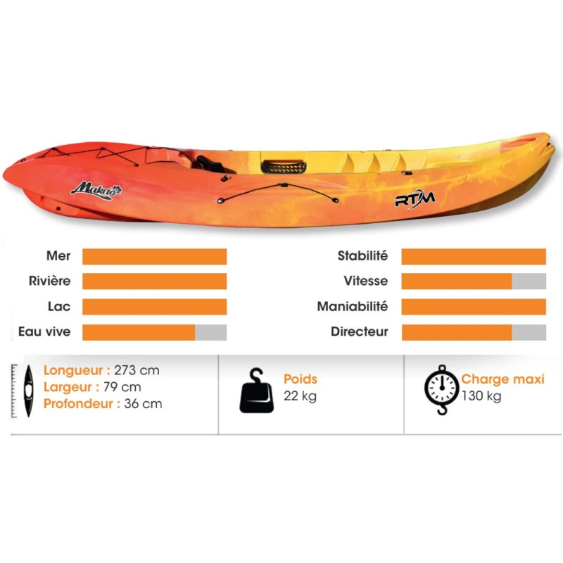 Le Makao est court, seulement 273 cm il est donc léger et très facile a manœuvré, il est aussi relativement large, pour une bonne stabilité convenante a de nombreuse utilisation comme le jeu, la balade et même la pêche !