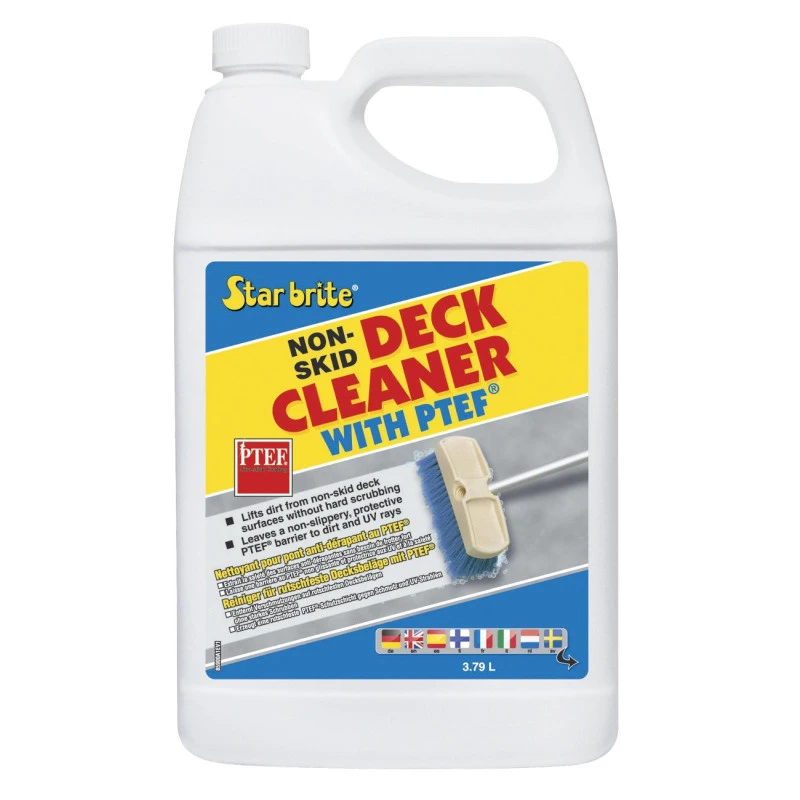 Produit nettoyant pour les ponts antidérapants des bateaux. Ce produit STAR BRITE élimine la saleté incustrée et les tâches du pont anti-dérapant en toute sécurité puisqu’il ne contient pas d’agents nocifs. Disponible en en flacon de 1 L ou en bidon de 3,785 L.