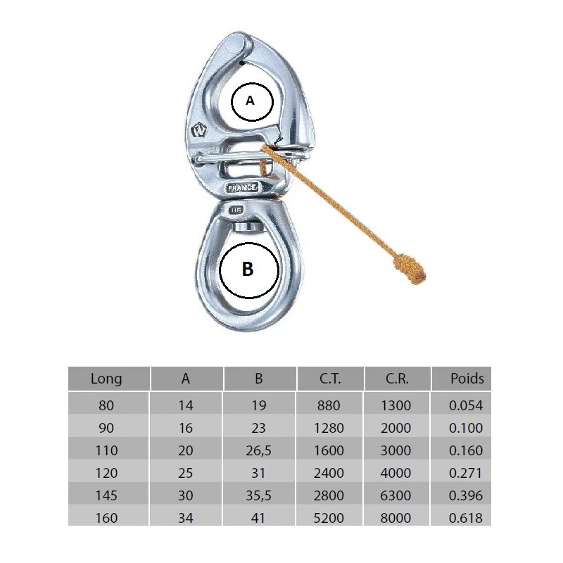 Caractéristiques techniques du mousqueton à ouverture sous charge WICHARD à grand oeil :